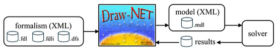 DrawNET allows us to design and solve models in any graph-based formalism. It is written in Java and is based on the DNlib library. It offers an editor for the design of new formalisms and models that will be saved in XML files. It has been used in various contexts (e.g., [32,33,34]).