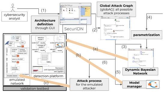 Figure 3 shows step-by-step how SecuriDN is used and how it interacts with the validation testbed. In brief, the numbered arrows in the picture describe SecuriDN’s functionalities that, from the definition of the architecture, allow us to derive attack processes and a detection model with its manager. The thick arrows labeled with letters show how SecuriDN’s artifacts are integrated in the validation testbed.