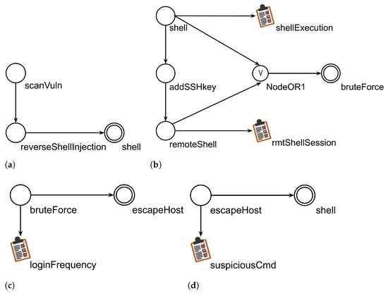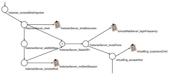 In a locAG also analytics appear, i.e., units of a monitoring system that collect information useful to expose adversarial activities (these are inspired by the MITRE project CAR [35]). They are depicted as notepads in Figure 2. In this work, we will not discuss analytics, since the paper focuses on the attack processes (an example of analytics is reported in [5]).