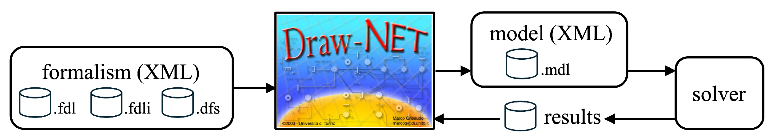 - Codetta Raiteri, D.; Franceschinis, G.; Gribaudo, M. Defining formalisms and models in the Draw-Net Modelling System. In Proceedings of the International Workshop on Modelling of Objects, Components and Agents, Turku, Finland, 26 June 2006; pp. 123–144. [Google Scholar]