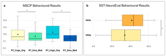 Behavioural indices derived from both the MSCP (EmoScore_Org, EmoScore_Med, CogScore_Org, CogScore_Med, RT_Emo_Org, RT_Cog_Org, RT_Emo_Med, RT_Cog_Med) and SST-NeuroEval (StressReg, StressTol, VAS-Prep, VAS-Exp, MetaStress, MetaTime) were analysed in parallel using repeated-measures ANOVAs where applicable.