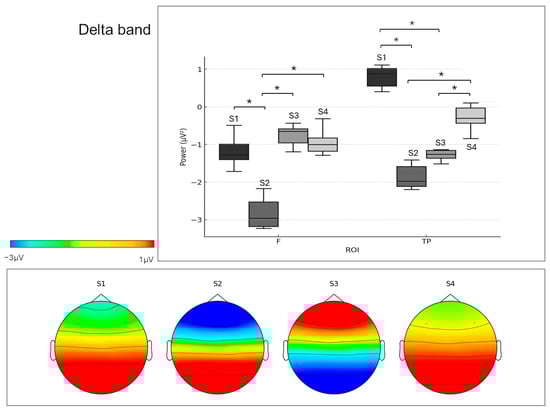 Delta activity exhibited significant frontal increases in S1 and S4 compared to the other conditions, with marked differences relative to S2 and S3. In S3, an inverse topographical pattern was observed, with predominance in temporo-parietal regions over frontal regions, indicating a functional reconfiguration as a function of scenario characteristics. In the temporo-parietal ROI, delta power was significantly elevated in S1, S4, and S2 compared to S3.