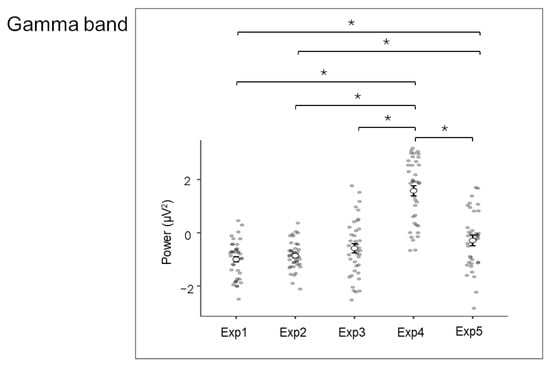 Gamma band power (µV2) across exposure phases (Exp1–Exp5) in the Social Stress Test—NeuroEval (SST-NeuroEval). Each point represents an individual participant; black circles indicate group means ± standard error. Bars represent ±1 standard error and stars (*) mark statistically significant effects.