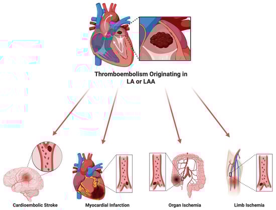 Complications of AF. Thrombi that form in the left atrium (LA) or left atrial appendage (LAA) can travel to distant sites and produce ischemia in the brain (cardioembolic stroke), heart (myocardial infarction), or general organs and limbs. Created in BioRender by Hassan, O. (2025) https://BioRender.com/evhczt8.