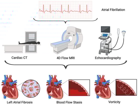 Following diagnosis, treatment of AF is categorized into two major strategies: rhythm control and rate control, often nuanced and guided by presentation of symptoms and hemodynamic stability [11,12]. Abnormal rhythm is managed by pharmacological or electrical cardioversion, again dependent on hemodynamic stability, amongst other factors [11,12]. Additionally, abnormal rate control is acutely managed with beta blockers or non-dihydropyridine calcium channel blockers, dependent on potential contraindications and side effect profiles [12]. Given the multitude of factors involved in deciding between rate and rhythm control, shared decision making with patients is essential [12]. Interestingly, treatment strategies for both rate and rhythm control are directly modulated by the percentage of left ventricular ejection fraction which is quantified by transesophageal echocardiography or cardiac MRI—underscoring the crucial role of imaging in AF treatment [11]. In addition to directing pharmacotherapy, imaging is quintessential in advancing long-term health outcomes through its role in guiding cardiac catheter ablation procedures. Specifically, when AF is attributed to an underlying structural abnormality, which can only be definitively identified through cardiac imaging, cardiac catheter ablation offers a therapeutic intervention by directly targeting and correcting the structural pathology [11,12]. This approach has the potential to prevent subsequent complications associated with AF, namely stroke, and to reduce the overall burden of the arrhythmia [11]. Given the growing evidence on the fundamental role of imaging in AF treatment, both pharmacologic and interventional, it is important to explore what other information can be isolated by cardiac imaging to facilitate early detection, ultimately preventing complications of AF.