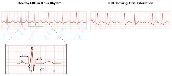 The current standard of care analysis, for the purpose of this review article, can be consolidated into diagnosis and management. While there are many nuances to the standard of care, dependent on AF type and other risk factors, the current guidelines formulated by Andrade et al. (2020) and Joglar et al. (2023) comprehensively cover these details [11,12]. In clinical practice, a 12–lead electrocardiogram (ECG) is often used to confirm the diagnosis of AF due to its high sensitivity and specificity compared to other diagnostic techniques [13]—specifically characterized by an absence of a clear P wave, as seen in Figure 3 [11]. In non-diagnosed patients with PAF, the ECG may capture sinus rhythm at the time of testing, which makes ECG-based detection of AF unreliable [11]. In these patients, non-invasive imaging techniques can be leveraged in routine practice, to detect hemodynamic markers that inform on a patient’s paroxysmal AF status, which remain evident even in sinus rhythm [14]. This gap in coverage presents a unique opportunity for non-invasive imaging to integrate into specialized practice to detect remodeling and hemodynamic markers associated with AF to identify the underlying mechanistic causes of AF, ultimately fostering a preventative approach.