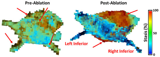 Representative analysis of blood flow stasis in the LA and LAA in a patient with paroxysmal atrial fibrillation, before and after ablation. Red arrows point to regions of elevated stasis. Image derived from 4D flow magnetic resonance imaging, as part of an ongoing, unpublished work.
