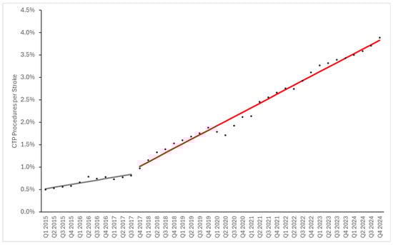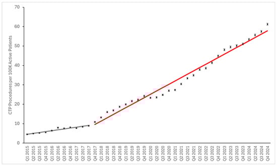 CTP utilization per 100,000 active patients rose steadily from Q1 of 2015 to Q3 of 2017, ranging from 4.32 CTPs per 100,000 to 9.45 per 100,000 (Figure 1). CTP utilization then began to increase more rapidly in a near-linear fashion beginning in Q4 of 2017, reaching 61.24 per 100,000 in Q4 of 2024. Segmental regression shows that the observations fit well to a pattern of linear growth that accelerated beginning at the Q4 2017 inflection point (R2 = 0.92 for the baseline segment and R2 = 0.98 for the post-event segment). The baseline rate of growth obtained from linear regression was 0.45 ± 0.04 per 100 K active patients per quarter, and the slope of the trend after Q4 2017 was 1.72 ± 0.05.