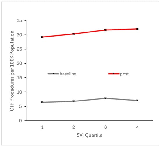 Number of patients per 100 K active patients across all baseline quarters (i.e., prior to Q4 2017) and across all quarters in the subsequent four years undergoing CTP, stratified by SES social vulnerability index quartile. Higher quartile denotes higher vulnerability, which is typically associated with lower SES.