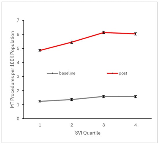 Number of patients per 100 K active patients across all baseline quarters (i.e., prior to Q4 2017) and across all quarters in the subsequent four years undergoing MT, stratified by SES social vulnerability index quartile. Higher quartile denotes higher vulnerability, which is typically associated with lower SES.