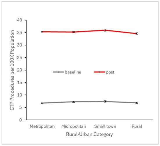 Number of patients per 100 K active patients across all baseline quarters (i.e., prior to Q4 2017) and across all quarters in the subsequent four years undergoing CTP, stratified by rural–urban category.