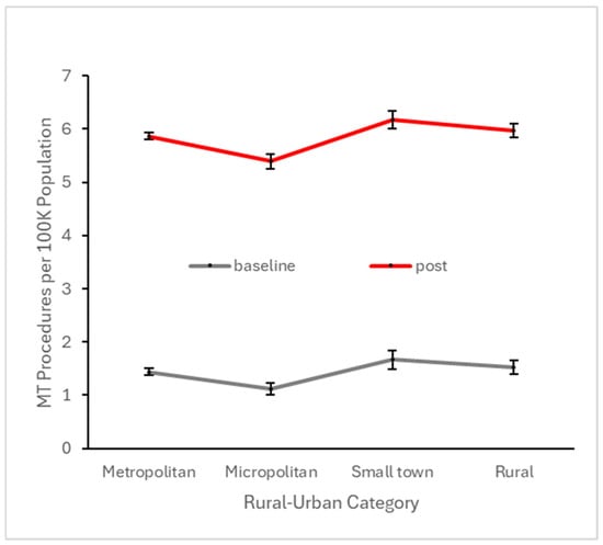 Number of patients per 100 K active patients across all baseline quarters (i.e., prior to Q4 2017) and across all quarters in the subsequent four years undergoing MT, stratified by rural–urban category.