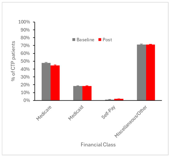 Percent of CTP patients averaged across all baseline quarters (i.e., prior to Q4 2017) and across all quarters in the subsequent four years, stratified by financial class (payer type). Error bars represent SEM.