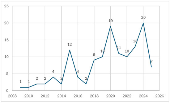 The paper includes publications from 2009 to 2025. Figure 1 shows a chart showing the number of articles by year included in the review. The authors’ goal was to achieve a review of state-of-the-art technologies, and the structure of the publication years indicates that. The most publications were from the year 2024—20 positions, and 2020—19. The approximately two-and-a-half-year period, as at the time of writing this paragraph, is August 2025 up to 2023, consisting of 30.23% of the articles. The almost five-year publishing period from 2020 to 2025 consists of 62,02% of the articles. Figure 1 shows publication number in the horizontal axis and the years published in the vertical axis.