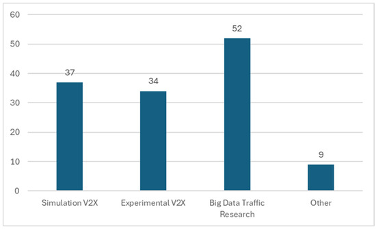 In this subsection, research is divided into four groups: experimental papers that concern real-world text, papers that use simulations to evaluate proposed V2X-related methods, papers that are related to big data research in traffic engineering, and the fourth group—others that are not suitable for classification to previous groups, such as databases, law documents, other types of documents that are not scientific work, web pages, and one study applicable to the discussed technology, without V2X purpose. For the first group, “Experimental V2X” articles with field tests among the simulations presented are included. The numbers of all groups are presented in Figure 2. The highest publication number is in the third group that includes big data traffic research, with a number of 52. However, the first two groups concerning V2X research consist of 71 papers.