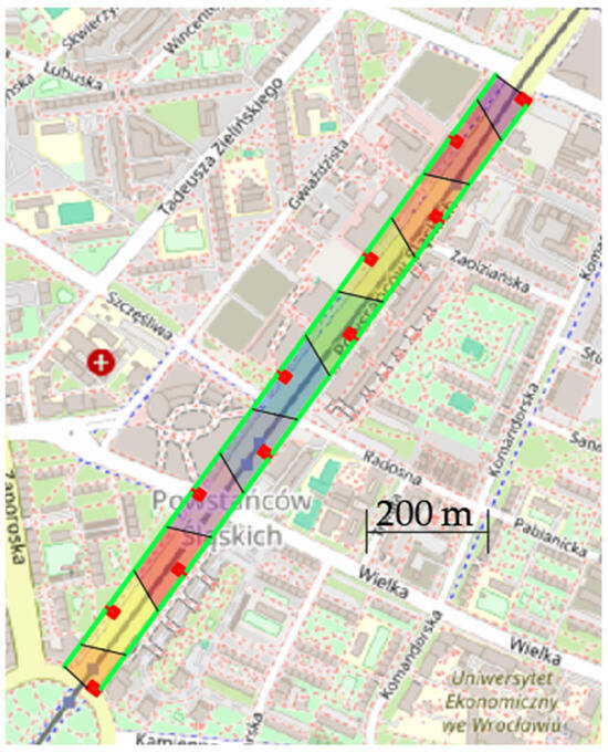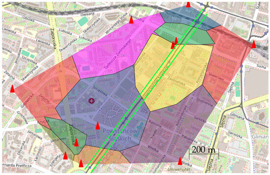 RSUs in a connected environment can provide the same type of data as BTSs. According to the review, the displacement of RSUs has to be a few times denser. Based on the review in the hypothetical case study, 120 m is assumed. RSUs are placed in two rows every 240 m. Therefore, from one to another is around 120 m. In Figure 5, the layout of the RSU is proposed on the street of the case study, with the Voronoi Diagram range for each RSU. The coverage in such a scenario is much more precise. Consequently, the data exhibits reduced bias, improved accuracy, and greater usability. TAZs derived from RSUs can be aligned with traditional zoning schemes, as illustrated in Figure 4, due to their significantly smaller size—typically a 120 m trapezoid, compared to conventional polygons that may span several dozen meters to over a kilometer. Furthermore, the increased spatial resolution of these zones enables the classification of trip origins and destinations based on land use, even within TAZs that serve mixed functions. For example, this approach allows for differentiation in areas such as the Powstańców Śląskich district, which includes both residential and commercial zones, as demonstrated in the case study. In the much smaller zones, it is possible to identify, e.g., the 8 am origin of the trip as work due to the location of the last connected RSU by the commuter, and the destination as home, due to a zone with only residential buildings.