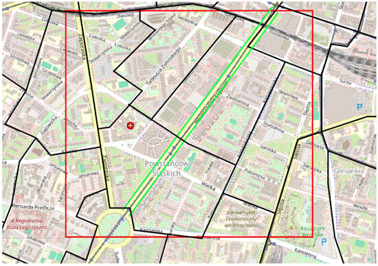 In Wrocław’s Comprehensive Traffic Research, zones are not comparable to the BTS transmission range. The classical TAZs are set according to the natural barriers (rivers, lakes, hills), streets, railroads, and historical district borders. Figure 4 shows classical zones in Wrocław’s Comprehensive Traffic Research 2018. In Figure 4, the red rectangle shows the borders of Figure 3; the green line represents Powstańców Śląskich street’s section shown in Figure 3.