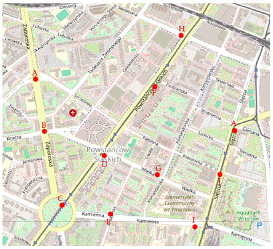 According to the literature examples from the review, an example BT/Wi-Fi scanner placement in the case scenario street is proposed in Figure 6. The scanner placement is shown as a red hexagon. The trips are recorded by scanning for identical MAC addresses of devices. For example, a trip along Powstańców Śląskich street would result in consecutive detections from scanners C-D-F-H, and a trip with an origin in the south-east of Figure 6 up to the northern end of the case study’s street would be an I-E-C-D-F-H trip. The trip with the destination in the middle of the street section would be C-D. Depending on the connected environment architecture, other technologies can be scanned. ZigBee is a promising source, as it operates similarly to BT and Wi-Fi at 2.4 GHz frequency.