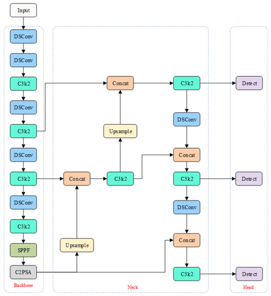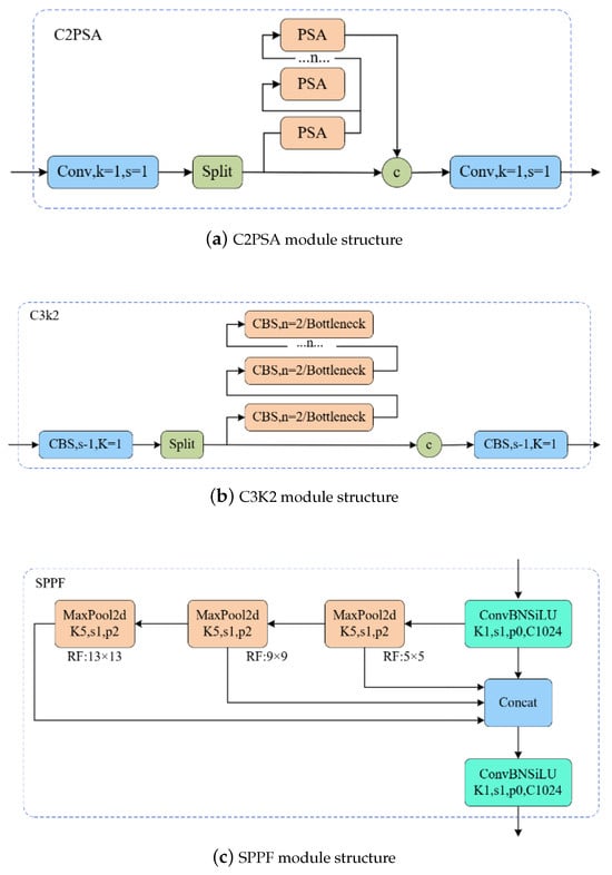 The backbone is responsible for hierarchical feature extraction and adopts the CSPDarknet architecture, enhanced with several newly designed modules, such as C3K2 and C2PSA. The C3K2 module combines and convolution kernels to achieve multi-scale feature representation. Specifically, the convolution captures local spatial features, while the convolution reduces the channel dimensionality, thereby decreasing computational complexity while preserving feature richness. This design significantly improves feature extraction efficiency without sacrificing representational capacity.