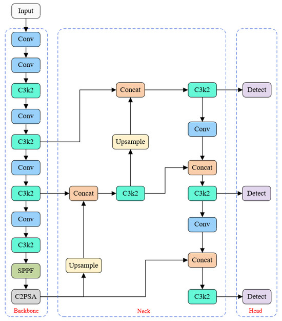 Overall network architecture of YOLOv11, which consists of four main components: the input layer, the backbone (enhanced with C3K2 and C2PSA modules), the neck (based on feature pyramid networks), and the anchor-free detection head.