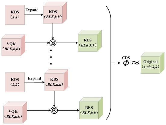 For example, a convolutional layer with a kernel size of , when using 2-bit quantization and a block size of , requires only about 7% of the original storage. This is achieved by storing the VQK in integer format, along with two sets of KDS tensors of size and two sets of CDS vectors of size . This design preserves the essential feature extraction capacity of the original convolution while maintaining a highly similar output distribution through fine-grained adjustment by KDS and CDS.