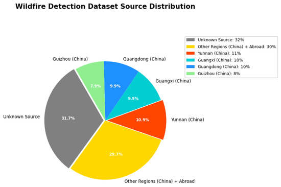 For Internet-based collection, the research focused on wildfire-prone regions in China (Southwest and South China) and abroad (e.g., California, USA; Alberta, Canada). Wildfire-related images and video materials were systematically gathered from social media platforms such as TikTok and Bilibili, as well as from search engines including Baidu, Google, and Yandex, ensuring comprehensive scene coverage. A total of 5000 images and 76 wildfire videos were obtained, as illustrated in Figure 6. Based on metadata completeness, the videos were divided into two categories: (1) 53 videos containing complete metadata (including occurrence time, geographic coordinates, and device information), and (2) 23 videos with partial metadata, which were retained to enrich the dataset scale and diversity.