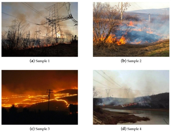 Among them, 312 images contain specific transmission line elements such as towers and conductors, which provide critical data support for wildfire detection in complex environments. Representative samples are shown in Figure 8.