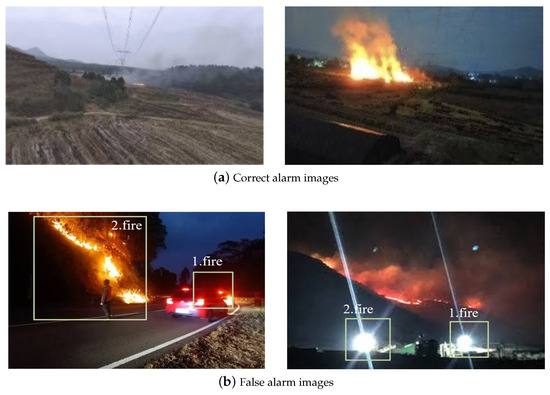 In addition, 3000 background images were collected, primarily including artificial illumination, mountain mist, and cloud patterns in the sky. As shown in Figure 9, Figure 9a presents a true alarm case. The camera was mounted on a transmission tower at a high altitude. During the daytime, farmland burning produced flames and smoke that occupied only a very small proportion of the image, with weak visual features. Due to the long distance, flame contours were barely visible, while solar reflections on the water surface appeared visually similar to flame features, further complicating model discrimination. At night, although flame and smoke features became more apparent when the fire spread, interference from reflections on greenhouse surfaces and nearby street lights still posed challenges for accurate detection.