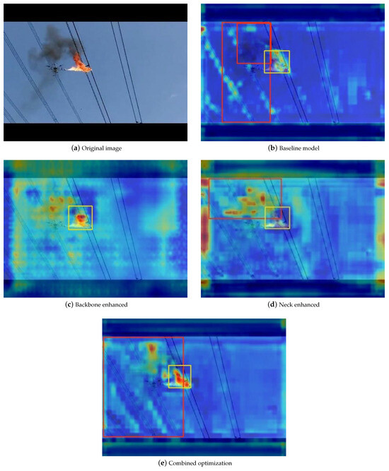 The feature heatmaps visualized in Figure 10 further validate the contribution of MSCA in enhancing the model’s attention to target regions. Specifically, backbone optimization strengthened flame localization (Figure 10c), while neck enhancement improved the detection of diffuse smoke regions (Figure 10d). The joint optimization strategy (Figure 10e) exhibited the most robust feature extraction capability, effectively capturing both wildfire and smoke targets. These results confirm the efficacy of the MSCA module from the perspective of feature space representation.