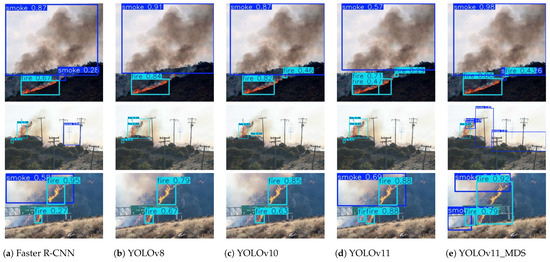 To evaluate the detection performance of YOLOv11_MDS, comparative experiments were conducted under a unified experimental environment with consistent hardware configurations and hyperparameters. Since our proposed method is a variant built upon YOLO11, we first compare it directly with the original YOLO11 to evaluate the effectiveness of the introduced modules. In addition, we include YOLOv8, which is still one of the most widely used and recognized baseline detectors in both academia and industry, as well as YOLOv10, the latest SOTA YOLO model with an end-to-end NMS-free design. This selection ensures that the comparison covers both mainstream baseline detectors (YOLOv8 and YOLO11) and the most recent state-of-the-art architecture (YOLOv10), along with the two-stage detector Faster R-CNN. As shown in Table 6, YOLOv11_MDS achieved superior results in two key metrics: recall (88.24%) and overall accuracy (mAP@0.5 = 88.21%), while also demonstrating faster detection speed compared with other models. These results confirm that the proposed method provides stronger recognition capability for flame and smoke targets in transmission line scenarios.