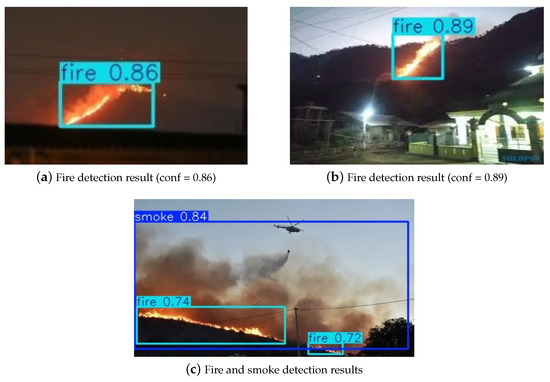 To further validate the generalization ability and robustness of the proposed model, we trained it on the publicly available The Wildfire Dataset provided by Ismail El Madafri on the Kaggle platform and evaluated its performance on the independent test set. Figure 12 presents representative detection results on this dataset, while Table 7 summarizes the comparative performance against mainstream detection models. These experiments were designed to ensure a fair evaluation and to assess the adaptability of the proposed method to previously unseen data with distributional differences.