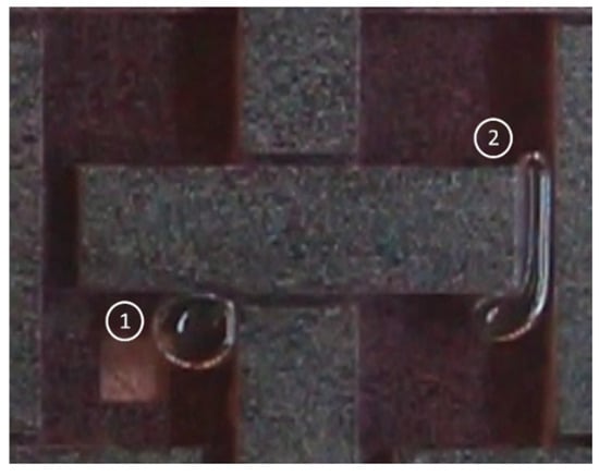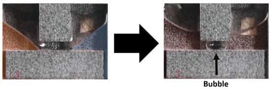 Each experiment starts with the dry porous medium placed inside the mold cavity, and when the inlet is opened, the test fluid starts to flow through the open channels within the porous medium, which naturally generates bubbles by mechanical air entrapment, similarly to what can be observed in LCM manufacturing. An example of bubble formation through the flow-front mechanical air entrapment is depicted in Figure 3. In each experiment, a constant flowrate was imposed using an Isojet® pump system (Isojet, Corbas, France), ranging from 10 g/min to 100 g/min. The flow-front progression and bubble formation inside the porous medium were recorded by a video camera (Teledyne, Thousand Oaks, CA, USA), filming with a resolution of 1280 × 720 pixels at 50 frames per second. No fluid-coloring agents or other contrast-enhancing techniques to ease the segmentation task were used to validate the generic applicability of the proposed methodology, thus eliminating the need for elaborated LCM setups. It is important to emphasize that the decision to avoid fluid-coloring agents or enhanced lighting conditions was not merely for experimental simplicity but rather to validate the algorithm’s performance under realistic, close-to-industrial conditions, where such preparations may be impractical or undesirable. This approach ensures that the proposed methodology can be more readily implemented in actual LCM manufacturing environments without requiring specialized experimental setups.