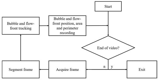 The developed algorithm conducts an analysis on a frame-by-frame basis, from the video recording, as shown by the flowchart in Figure 4. Until the end condition is met, the algorithm extracts a new frame from the video feed and segments it. This segmentation procedure allows for the subsequent detection of all objects of interest (bubbles and fluid flow-front), as well as the processing of their relevant properties, such as area, perimeter, and position in the selected frame. Finally, due to the high number of bubbles that can be generated in experiments, a tracking algorithm was formulated to ensure that the measured properties are assigned to the correct bubble, by which a unique label is attributed to each newly detected bubble in the video feed. Thus, the general algorithm can be divided into two main modules: video frame acquisition and segmentation, and bubble and flow-front tracking. All modules were developed using the Python (version 3.10) programming language. The detailed functioning of these modules is elaborated on in the following sections.