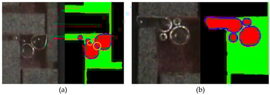 To create the ground-truth masks, an image with resolution equal to the original frame is created, where the output classes are one-hot-encoded in RGB format. In this study, four different classes are intended: flow-front (encoded in green channel), bubble core (encoded in red channel), bubble edge (encoded in blue channel), and background (encoded in black—all channels have null pixel intensity). The flow-front class refers to the area occupied by the fluid, whereas the bubble core class encompasses the central region of the bubbles, up to the border region. The bubble edge class refers to the border region of the bubbles, the width of which is about 1 pixel. The idea behind the implementation of this class is to avoid the implementation of post-processing algorithms such as watershed separation, which would be necessary to define the contour of touching bubbles, if only the bubble core class was implemented. In turn, a more reliable segmentation is expected using this strategy since actual morphological data are used, as well as faster post-processing times since there is no need to implement additional algorithms. The background class refers to the regions which do not provide any object of interest. A depiction of all classes is provided in Figure 5.