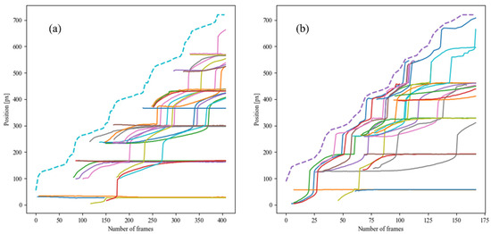 Regarding the tracking algorithm, the most demanding situation for the algorithm is when a bubble traverses a narrow channel of the porous medium, as depicted in Figure 9—bubble 2. Due to surface tension effects in combination with higher local fluid flow velocities, the bubble suffers an abrupt increase in velocity while traversing a narrow gap, which can be registered as a position jump by the video recording apparatus, due to an insufficient frame rate. Nevertheless, when a bubble reaches the end of a narrow gap (Figure 9—bubble 1), its velocity decreases again due to the stabilization of the fluid flow velocity, as well as the absence of significant bubble deformation and therefore surface tension forces. The combination of these effects is visible in Figure 10, where the plotted bubbles’ position parallel to the flow direction versus the corresponding video recording frame number may possess a “step”-like appearance, reflecting the differences in local velocities. Similarly, the flow-front position plot (dashed line) also possesses a “step”-like appearance due to the local higher fluid flow velocities in the narrow gaps of the porous medium. A total of twenty-five bubbles chosen randomly were plotted per experiment in Figure 10 to ease visualization.