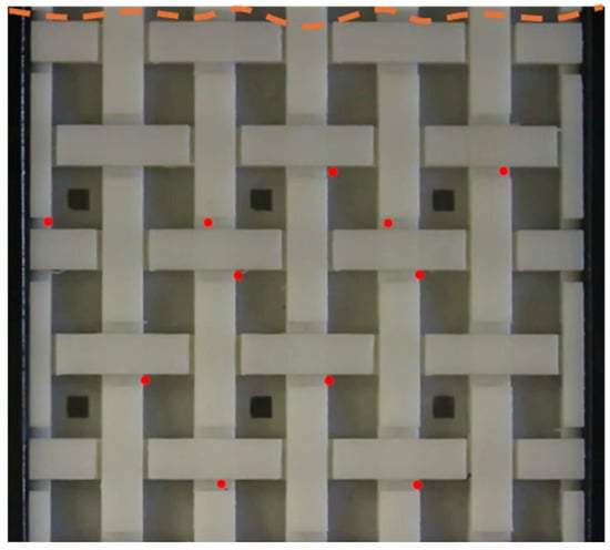 Moreover, taking the two-dimensional tracking results of the bubbles’ trajectories depicted in Figure 11, it can be seen that the bubbles’ trajectories are not rectilinear but instead possess tortuosity, which is given by the porous medium geometry. Nevertheless, not all bubbles appear to be mobile, as a portion of the plotted bubbles maintain the same position throughout the entire video capture in both experiments. This phenomenon has been experimentally observed, as bubbles may become entrapped inside the structure of the porous medium, as the structures resembling fiber tows block the bubbles’ movement and the local fluid velocity is low there, stagnating the bubble. An example is provided in Figure 12, as the red dots represent the centroid position of the entrapped bubbles in an experiment. In light of this, modeling approaches of bubble transport processes in Liquid Composite Molding should also consider the stochastic dimension of these phenomena, aside from a purely deterministic framework.