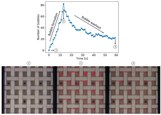 Number of recorded bubbles (detected by the algorithm highlighted in red): (1) experiment start; (2) flow-front reaches end of porous medium; (3) end of experiment with steady-state flow at the outlet.