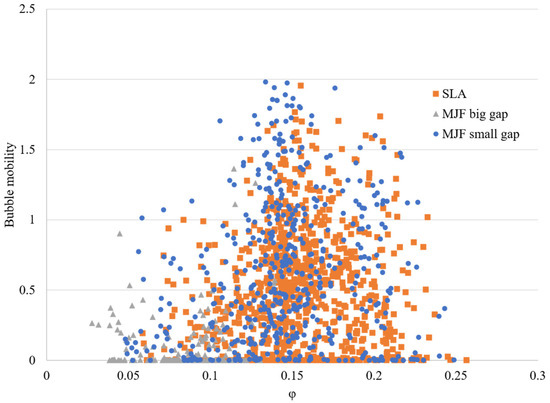 It is important to reinforce that zero mobility appears in all bins, since in all experiments there were bubbles which were formed in zones which did not provide any means for bubble movement. Moreover, as discussed in Section 3.2, throughout their trajectory, bubbles could become stagnant in one of those zones, therefore negatively impacting their mobility and contributing to the registered bubble mobility scatter.