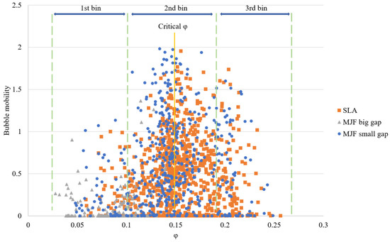 A more in-depth analysis of the data was conducted by dividing the scatterplot data into three different bins of equal size, thus taking advantage of the approximately symmetrical dataset. Hence, the first bin encompasses the left side of the suggested triangle, where a positive correlation between and bubble mobility is observed; the second bin encompasses the zone around the critical value; and the third bin encompasses the right side of the suggested triangle, where a negative correlation between and bubble mobility is observed. This data binning process can be seen in Figure 15.