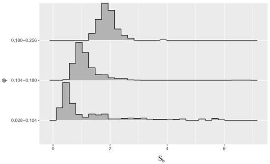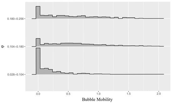 Finally, in the third bin’s histogram, it is possible to observe that the probability decreases with mobility (Figure 16), though this is less steep than in the first bin. The most probable scenario is still a bubble mobility close to null. Considering the third bin of , it is evident from Figure 18 that bubble sizes () tend to be larger than in the second bin. While the second bin is centered around one, it still falls within the middle of the range observed in the first bin. This suggests that as bubbles become larger than the gap size ( > 1), surface tension forces start to increase and consequently impede overall bubble mobility. This effect is observable in the scatterplot of Figure 15, where the envelope of bubble mobility takes a negative slope for values present in the third bin.