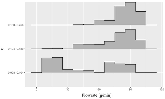 Having concluded the binning, data frequency measures were obtained for bubble mobility in each individual bin, and the respective histograms were computed (Figure 16). Moreover, for the ranges of for each bin, histograms were also computed for the corresponding flowrates and non-dimensional bubble sizes, presented in Figure 17 and Figure 18, respectively.