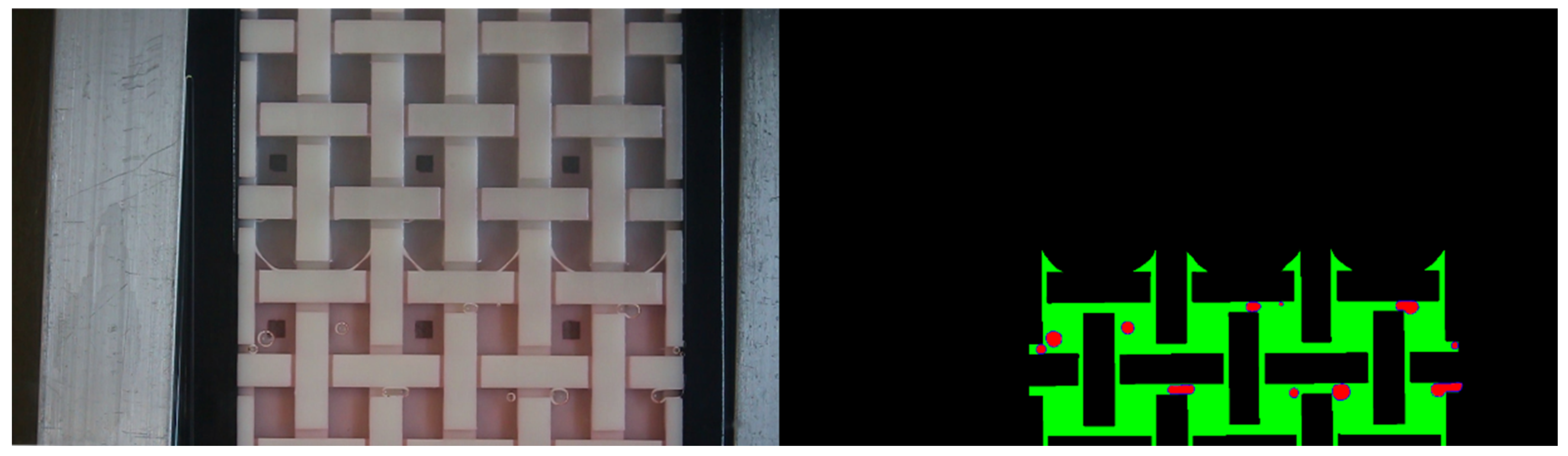 - Gangloff, J.J.; Hwang, W.R.; Advani, S.G. Characterization of bubble mobility in channel flow with fibrous porous media walls. Int. J. Multiph. Flow 2014, 60, 76–86. [Google Scholar] [CrossRef]