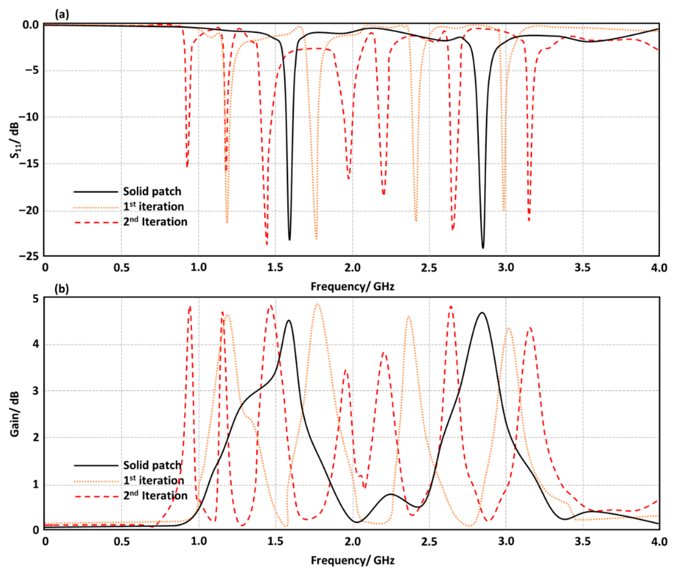 - Taher, F. Novel Reconfigurable Fractal Antenna Design for Modern Communication Systems. J. Adv. Res. Appl. Sci. Eng. Tech. 2025, 64, 47–57. [Google Scholar] [CrossRef]