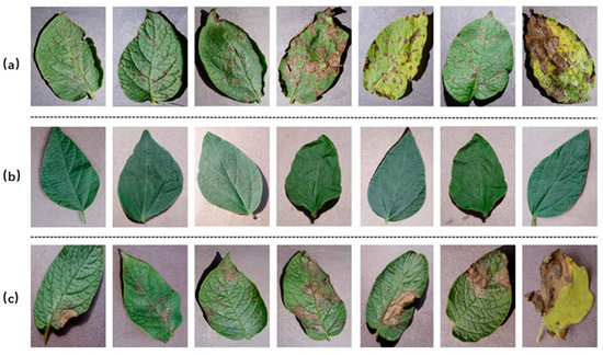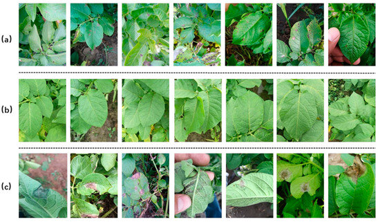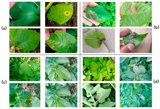 In addition to the publicly available dataset obtained from Kaggle, a ground dataset was constructed to ensure comprehensive coverage of potato leaf disease scenarios. The ground dataset was collected between 2011 and 2021 across major potato-producing regions in northern China, primarily in Hebei Province (Baoding, Zhangjiakou) and Shandong Province (Weifang, Yantai). Image acquisition took place during the potato growing season, typically from June to September, when disease incidence was most prevalent. Diseased leaves were identified by experienced field technicians under natural conditions, without the use of artificial inoculation. The ground dataset is shown in Figure 2.