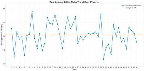 The effectiveness of augmentation was monitored using AugmentTracker, which recorded the frequency of each operation and computed the actual augmentation rate. This metric reflected the coverage of training samples and facilitated robust feature learning under variations in leaf orientation, illumination, and background conditions. All augmentation procedures were embedded into the data loading pipeline and executed synchronously with training, thereby introducing batch-wise randomness, mitigating overfitting, and enhancing both accuracy and generalization. Over 50 training epochs, the average augmentation rate was 50.19% (SD 1.66%) (Figure 4). This “on-the-fly augmentation” strategy ensured sufficient randomness and diversity in each training cycle, effectively alleviating overfitting and improving classification performance.