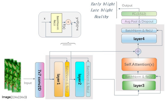 To address the above problems, this paper proposes a new method for potato disease leaf recognition based on ResNet18 and combined with self-attention mechanism and feature fusion to meet the challenge of multi-leaf feature extraction in complex backgrounds. The main contributions of this paper are as follows: