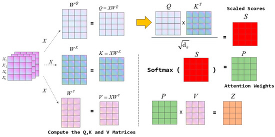 The Self-attention (SA) mechanism learns the correlations between elements in an input sequence X by mapping it into three representations: query (Q), key (K), and value (V). Specifically, the input sequence X undergoes a learnable linear transformation to generate Q, K, and V. An attention score matrix is then calculated by taking the dot product of the transpose of Q and K, which is then scaled to stabilize training. The scaled scores are subsequently converted into attention weights using a softmax function, quantifying the strength of the correlations between elements in the sequence. Finally, these attention weights are used to perform a weighted sum over V to produce the output sequence Y, which encapsulates contextual information. The overall structure of the Self-attention mechanism module is illustrated in Figure 6.