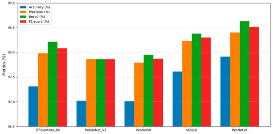 In the experimental results, A (%) denotes the accuracy of a single test, whereas A.avg (%) represents the mean accuracy and stability across multiple experiments. For single-shot accuracy, ResNet18 was observed to outperform the other models, achieving a maximum accuracy of 97.91%, corresponding to improvements of 0.6%, 0.89%, 0.9%, and 0.3% over the four aforementioned models, respectively. These results indicate its superior discriminative capability in single-shot prediction tasks. Moreover, ResNet18 attained an average accuracy of 96.51% ± 1.84%, maintaining high accuracy while exhibiting low variance and strong stability. By contrast, although ResNet50 achieved a higher average accuracy, its single-shot performance was slightly inferior to that of ResNet18, whereas EfficientNet-B0 demonstrated poor stability. Overall, ResNet18 achieved a favorable balance between accuracy and stability, underscoring its effectiveness and applicability for this task. Precision and Recall were recorded at 98.40% and 98.63%, respectively, with an F1-score (macro average) of 98.51%, representing the highest performance among all evaluated models. The superior performance of ResNet18 in Recall and F1-score indicates its capability not only to accurately classify the majority of samples, but also to effectively identify difficult-to-classify cases, thereby reducing missed detections. In comparison, models such as VGG16 and EfficientNet-B0 also exhibited strong performance, with F1-scores of 98.30% and 98.08%, respectively; however, slightly lower Recall and F1-scores were observed, suggesting that ResNet18 provides superior robustness and generalization while maintaining high accuracy.