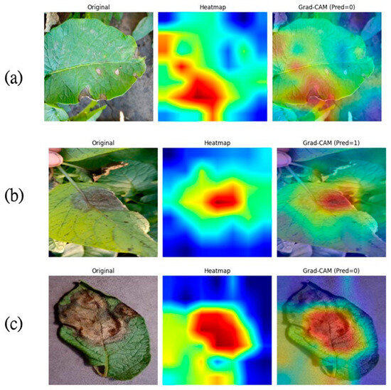 Grad-CAM visualization ((a) is early blight, (b) is late blight, and (c) is late blight from the public dataset).