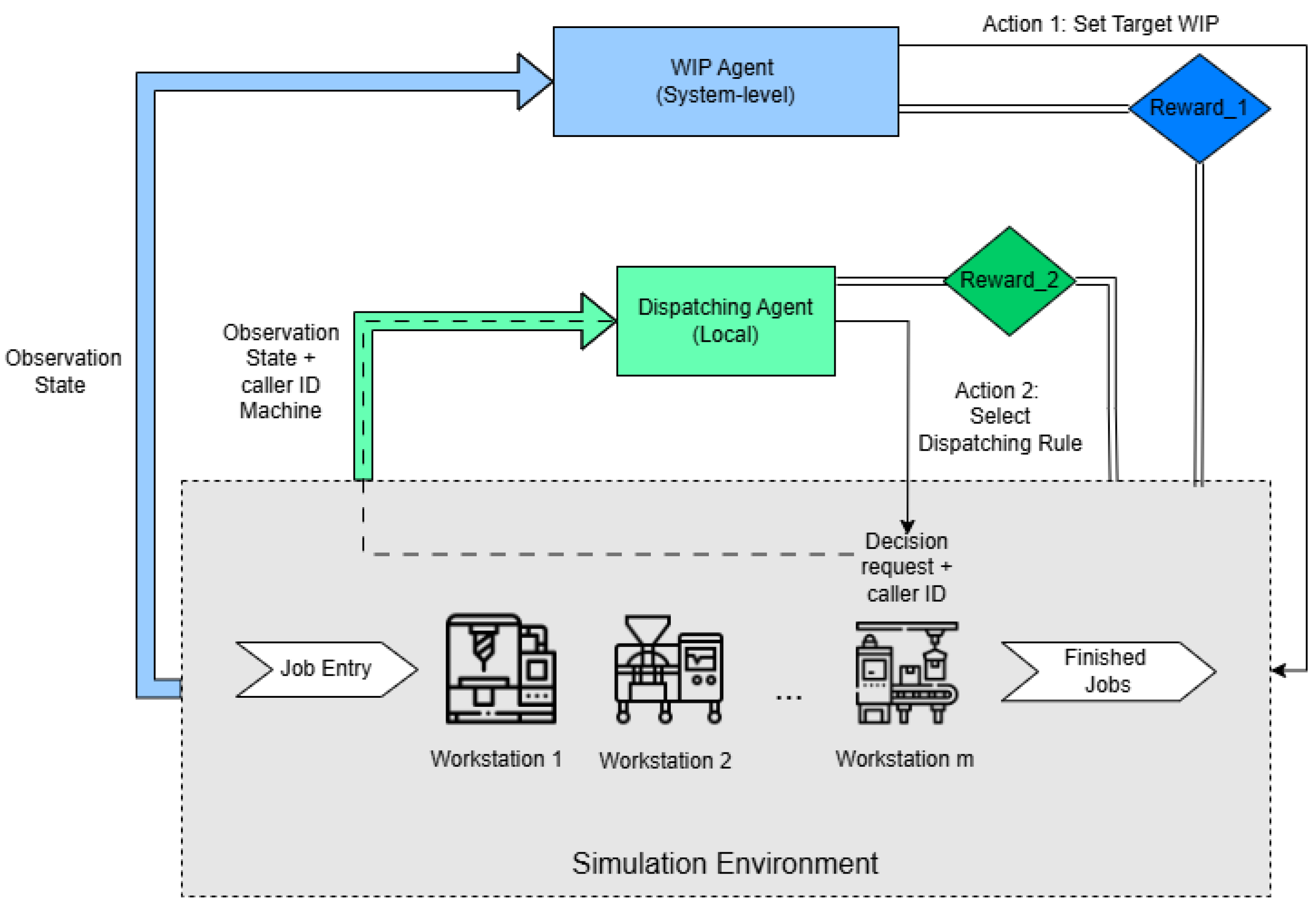 The training loop is driven by the simulation clock. The strategic agent acts on a fixed time-based schedule (), making high-level decisions about the system’s WIP level. In contrast, the tactical agent is event-driven, reacting instantly to ‛MachineFreed‛ events to make local sequencing decisions. This dual-timescale, hybrid activation mechanism allows the system to balance long-term strategic planning with real-time tactical adaptation.